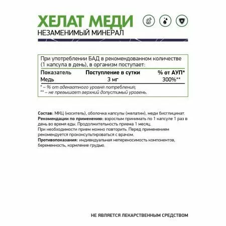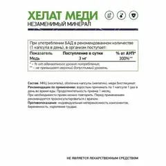 Хелат меди - важный минерал в легкоусваиваемой форме, который входит в состав многих ферментов и белков. В организме самостоятельно не вырабатывается. Играет важную роль в выработке гемоглобина и красных кровяных телец, способствует нормализации артериального давления. Медь способствует повышению минеральной плотности костной ткани, в индивидуальных случаях применяется для профилактики и лечения остеопороза. Она также играет важную роль в развитии и поддержании соединительной ткани, участвует в производстве коллагена, который является важным структурным компонентом нашего организма. Добавка используется для комплексной борьбы с такими состояниями, как усталость или ослабленный иммунитет, низкая температура тела и бледность кожных покровов, ломкие ногти и истончение волос, боль в мышцах и суставах, кожные воспаления. Медь проявляет антиоксидантные свойства, способствует сохранению цвета волос и предупреждению появления седины