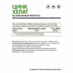 Цинк Хелат – незаменимый микроэлемент в легко усваиваемой форме. Стоит на страже красоты и здоровья, играет важную роль в процессах функционирования органов пищеварения. Цинк как микроэлемент стимулирует кровенаполнение капилляров слизистых оболочек желудочно-кишечного тракта, обладает противоязвенным свойством, способствует ускорению регенерации поврежденного эпителия ЖКТ. Цинк принимает непосредственное участие в процессах, связанных с усиленным клеточным делением: период интенсивного роста организма, процессы рубцевания ран и ожогов. Также цинк участвует в синтезе коллагена, способствует повышению тонуса кожи, ускорению заживления ран, используется для профилактики кожных заболеваний. Активно участвует в иммуногенезе (способствует укреплению иммунной системы), опосредованно влияя на синтез Т-лимфоцитов и выработку интерферонов. Цинк играет важную роль в выработке гормонов. У мужчин ионы цинка участвуют в процессе полового созревания и сперматогенеза, способствуют синтезу тестостерона. У женщин – способствуют нормализации функционирования репродуктивной системы.