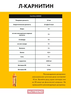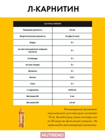 Nutrend Carnitine 100000 — один из продуктов с самым высоким содержанием жидкой карнитиновой основы на рынке. Карнитин — это вещество, которое естественным образом встречается в организме и которое организм может синтезировать из аминокислот L-лизина, L-метионина и L-глицина в присутствии витамина C, витамина B6 и железа. Даже низкий уровень некоторых из этих веществ может сделать синтез карнитина недостаточным. Благодаря этому карнитин особенно полезен во время восстановительных диет, а также в моменты усталости и умственного истощения. В нормальных условиях дозы 10 мл этого концентрата должно быть достаточно. 1000 мг L-карнитина на порцию 100 доз в упаковке Обогащен витаминами B5 и B6, которые способствуют снятию усталости и нормальному энергетическому обмену Без сахара Эффективное использование организмом Подходит во время занятий спортом или при снижении диеты