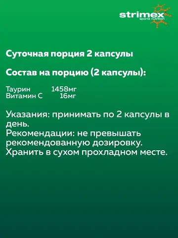 Таурин — аминокислота натурального происхождения, участвующая в регуляции многих процессов в организме, в том числе обеспечивающая приток питательных веществ к мышцам и бесперебойную работу сердца. Таурин содержится в белковых продуктах животного происхождения: мясе, рыбе, молоке и т.д., и практически отсутствует в растительных продуктах. Поэтому веганы и вегетарианцы нередко испытывают недостаток таурина в крови. Почему Strimex Taurine важен? Таурин регулирует работу мозга, нервной системы и кровяное давление. Кроме того, он снижает концентрацию плохого холестерина в крови, препятствуя развитию атеросклеротических процессов. Таурин работает и как нейромедиатор, улучшающий работу мозга и увеличивающий работоспособность. Поэтому, в последнее время его все чаще включают в состав энергетических напитков. Есть данные о повышении усвояемости креатина (основной аминокислоты, участвующей в строительстве мышц клеток), при его совместном использовании с таурином. Taurine от Strimex имеет высокую концентрацию продукта в каждой капсуле. Добавляйте таурин в каждодневный рацион как при наборе массы, так и при похудении, для достижения максимальных результатов.