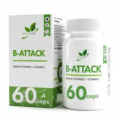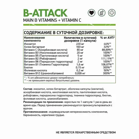 Комплекс незаменимых витаминов группы В для поддержания нервной системы. Витамин B1 (Тиамин). Обеспечивает функционирование нервной системы, способствует улучшению памяти и концентрации внимания, нормализации работы кишечного тракта, участвует в метаболизме некоторых аминокислот. Витамин B2 (Рибофлавин). Участвует в обмене белков, жиров и углеводов, способствует улучшению зрения. Необходим для нервной системы, синтеза ферментов, участвующих в производстве витамина B6, кислотных реакциях, образовании эритроцитов, иммуноглобулинов. Витамин B3 (Никотиновая кислота). Поддерживает в здоровом состоянии кожу, слизистую оболочку кишечника и ротовой полости, участвует в обеспечении нормального зрения, способствует улучшению кровоснабжения и снижению повышенного давления. Необходим для выделения энергии из углеводов и жиров, а также для белкового обмена. Входит в состав ферментов, обеспечивающих клеточное дыхание. Витамин B5 (Пантотеновая кислота). Участвует в белковом, липидном, углеводном обменах, в синтезе гемоглобина, нейромедиаторов и гормонов, а также в процессах детоксикации. Способствует выработке питательных веществ для строения мышечной ткани, необходим для синтеза кофермента А. Витамин B6 (Пиридоксин). Способствует улучшению работы сердечно-сосудистой системы и головного мозга, обеспечивает усвоение белка и питание нервных клеток. Витамин B12 (Цианокобаламин). Участвует в процессах кроветворения, в метаболизме белков и жиров, кроветворении, защищает миелиновые оболочки нервных клеток, играет важную роль в метаболизме фолиевой кислоты. Является кофактором железа. Комплекс витаминов группы В способствует предотвращению сонливости, вялости, онемения мышц, укреплению иммунитета и повышению сопротивляемости организма к различным заболеваниям.