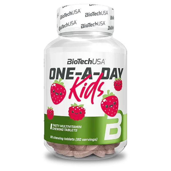 Детский витаминный комплекс (One A Day Kids от BiotechUSA) — это сбалансированный витаминно-минеральный комплекс в форме вкусных жевательных таблеток, разработанный специально для детей. Продукт содержит ключевые витамины A, B1–B12, C, D, E, K, а также цинк, селен и марганец — всё, что нужно для поддержания иммунитета, нормального роста, развития нервной системы и укрепления костей. Формула не содержит глютен и лактозу, а приятный клубничный вкус делает приём добавки комфортным даже для самых привередливых. Подходит для ежедневного применения в рамках сбалансированного рациона. Преимущества Полный набор витаминов и минералов, адаптированный для детей Поддержка иммунной системы, костей, зубов и зрения Способствует развитию памяти, концентрации и нервной системы Формат жевательных таблеток с приятным клубничным вкусом Без глютена, лактозы и искусственных красителей